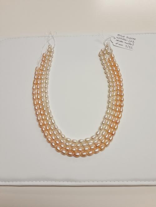 4 fili di PERLE BIANCHE e ROSATE COMPLETAMENTE NATURALI, di acqua dolce e senza nucleo (tutta sostanza perlifera) misura mm. 5/5,5