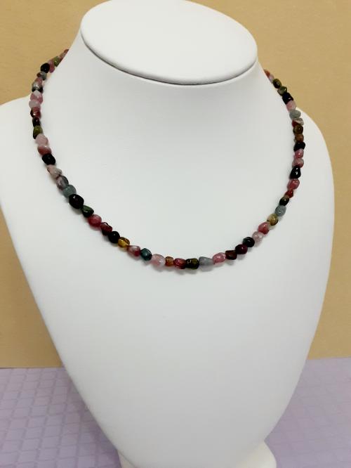 Collana con tormalina multicolore naturale (in qualità gemma con cristallizzazione evidente), forma a sassolino semigrezzo