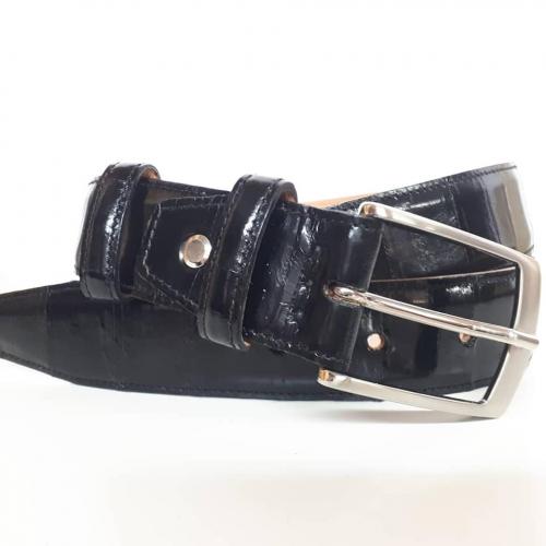 cintura in pelle di anguilla colore nero con fondo vero cuoio conciato al vegetale altezza 3,5 lunghezza regolabile lavorazione artigianale made in italy