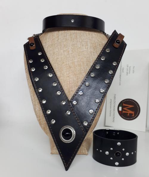 Collana bracciale e collare in vero cuoio con borchie e strass Swarovski oggetti realizzati a mano artigianato italiano vendo anche singolarmente spedizione gratuita in tutta italia
