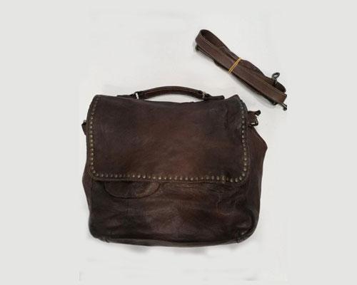 Borsa vintage tinta in capo e cerata a mano, realizzata artigianalmente in Italia. Il materiale utilizzato è pelle di vitello, pellame adatto per la produzione di borse vintage in quanto molto morbido ma resistente all'usura.